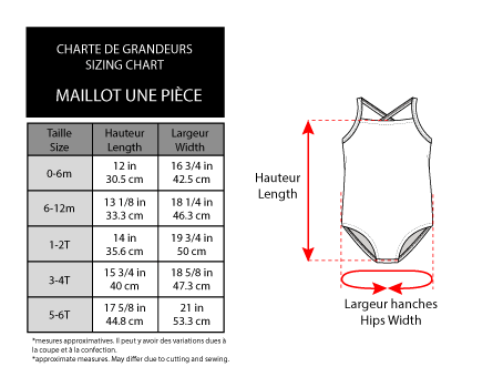 Disponible en taille 0-6m, 6-12m, 1-2T, 3-4T et 5-6T.