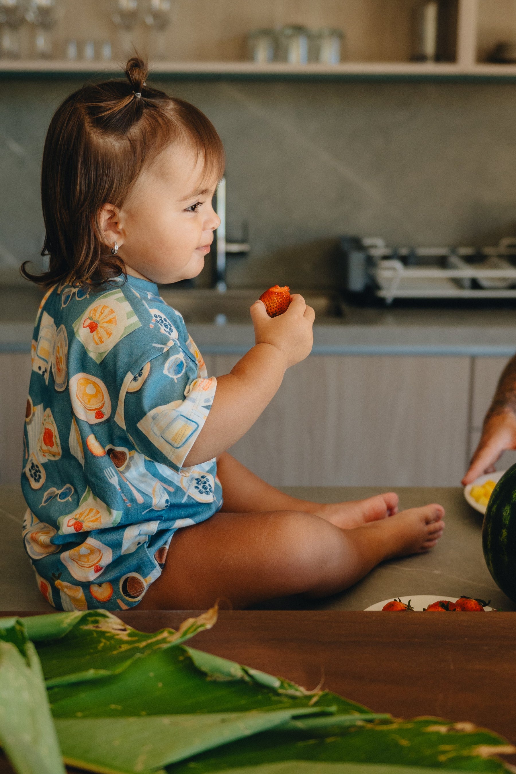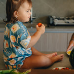 Inspiré des souvenirs d’été à la campagne, cet imprimé évoque les moments simples : jouer dehors, cueillir des fruits, courir dans l’herbe et profiter du soleil.