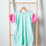 Les robes évoquent la nostalgie de l'enfance et de l'innocence. Mêlant couleurs vives et simplicité, le modèle Laguna Beach incarne la légèreté de la brise marine, la fraîcheur de l'océan et la douceur des couchers de soleil estivaux. Ce vêtement durable et écologique évoque une valorisation de la préservation de ces environnements naturels dont les écosystèmes, les ressources en eau, l'agriculture et même les plages, sont régulièrement menacés par les sécheresses !